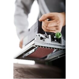 The 75 mm wide belt sander is the ideal tool for coarse and fine sanding of workpieces with absolute precision, parallel to the grain. Working in only one direction along the grain prevents sanding rings from developing, thereby eliminating laborious and time-consuming reworking. Easy to guide and comfortable to use, the BS 75 can also be quickly fitted to the flat area frame, significantly increasing the quality of your results. The available bench set can also quickly and easily convert the belt sander to a bench-mounted unit, and clean working conditions are guaranteed when used with a Festool Dust Extractor.