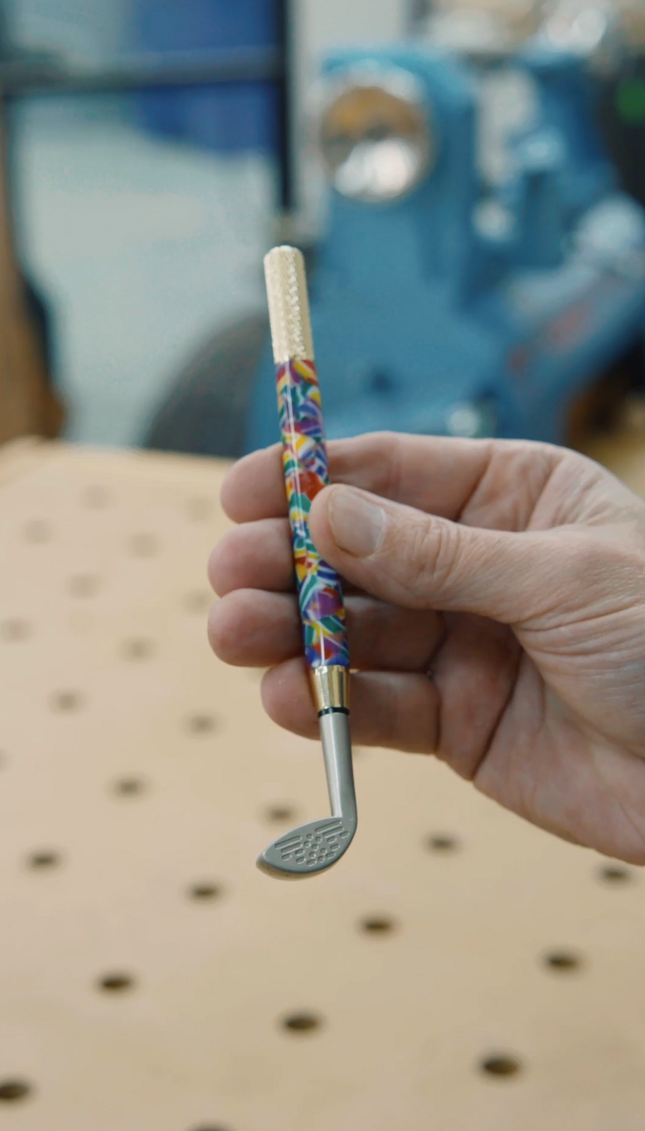 A distinctive pen with a rounded wood/driver-style end cap and a desk-golf ball for a quick putt at your desk.